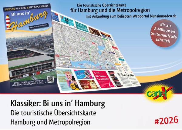 Mit «Bi uns in’ Hamburg» schaffen wir eine Übersicht für Freizeit- und Kulturangebote: Der Faltplan für das Hotel- und Gastgewerbe ist mit dem Freizeitplanungsportal biunsinnorden.de verbunden und bietet allen Werbetreibenden einen effektiven Zugang zu einer aktiven Zielgruppe.